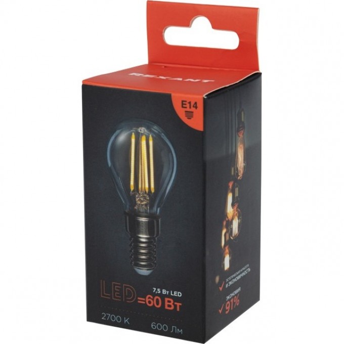 Лампа филаментная REXANT ШАРИК GL45 7,5Вт 600Лм 2700K E14 прозрачная колба 604-121