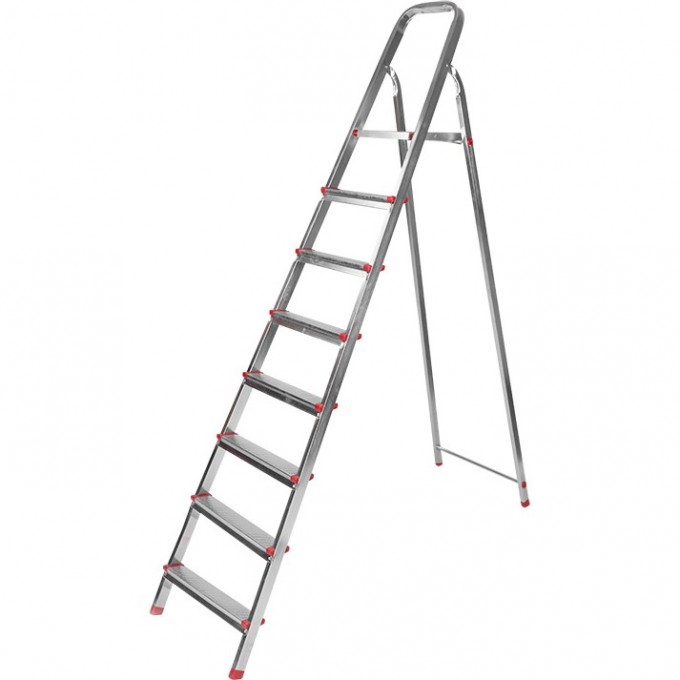 Стремянка металлическая состоит из 8 ступенек, применяется как в строительных целях, так и в быту, дома, на даче, в гараже и саду. Специальное соединительное ушко обеспечивает устойчивость конструкции и надежную фиксацию оборудования в рабочем положении. Ножки лестницы изготовлены в пластиковом покрытии; это предотвращает скольжение и защищает напольное покрытие от царапин, а упрочненное крепление ножек предотвращает их выпадение. Гальваническое покрытие гарантирует устойчивость к коррозии и защищает от негативного воздействия окружающей среды. Стремянка из усиленного профиля с 8 широкими ступенями с противоскользящим рифлением не занимает много места. Использование качественных материалов позволяет нагружать стремянку массой до 150 кг.