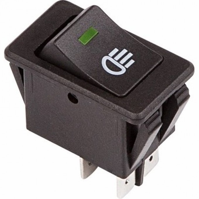 Выключатель клавишный 12V 35А (4с) ON-OFF  с зеленой подсветкой предназначен для коммутации электрических цепей напряжением 12В. Такой клавишный переключатель применяются в качестве комплектующих изделий автотранспортного электрооборудования (в легковых и грузовых автомобилях, автобусах и других транспортных средствах). Клавиша включения внешнего освещения имеет два положения и подсветку. Принцип действия основан на перемещении клавиши в одну из позиций. Для переключения в нужное положение требуется приложить некоторые усилия на клавишу. Монтаж осуществляется без применения винтов на плоских панелях толщиной от 0.8мм до 3мм. Подключение клавиши осуществляется с помощью плоских клемм или пайкой контактов.